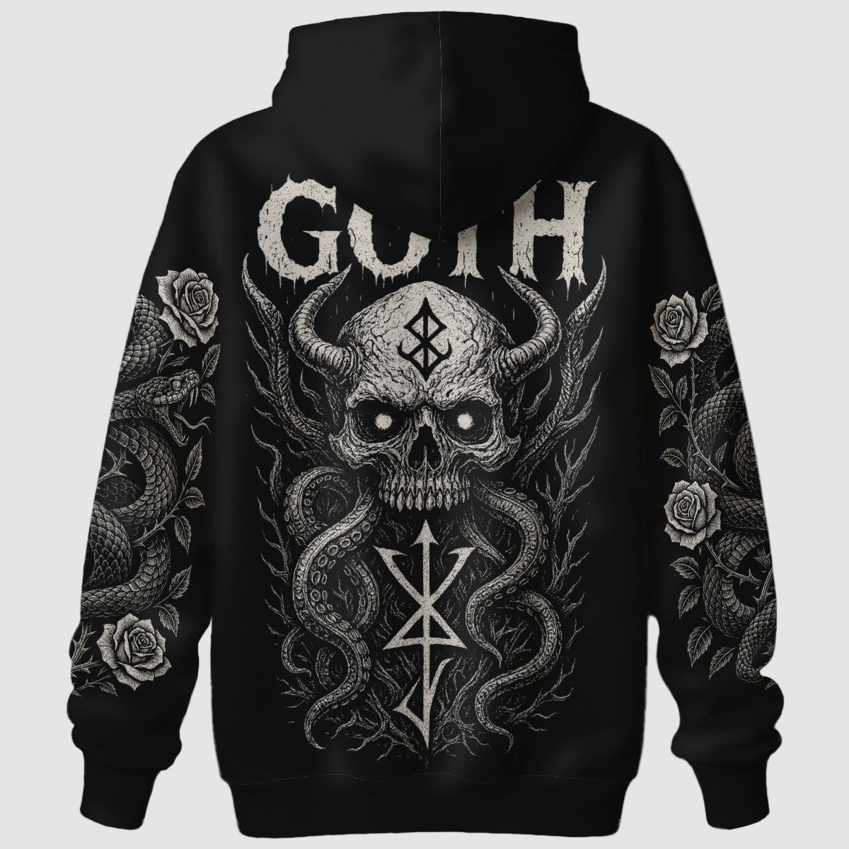 Izpaud savu individualitāti ar unikālo džemperi „The Serpent’s Oath” - radītu gotiskās estētikas un alternatīvās modes cienītājiem. Tumšais dizains ar galvaskausu, čūsku un rožu motīviem simbolizē spēku, noslēpumu un iekšējo mieru. Tas nav tikai apģērbs – tas ir stila manifests.