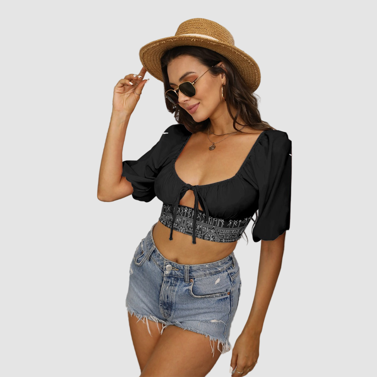 - Īss tops ar sasienamu priekšpusi un rāvējslēdzēju aizmugurē